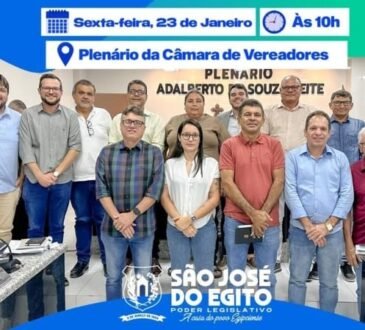 São José do EgitoCâmara volta aos trabalhos legislativos com primeira sessão do ano nesta sexta (23)A Câmara de Vereadores de São José do Egito realiza nesta sexta-feira (23) a 1ª Sessão Ordinária do 1º Período...
