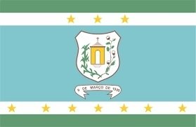O texto também mantém os elementos centrais da bandeira, como o brasão com a capela, o ramo de algodão e o ramo de milho, além da faixa com a data de emancipação política do município, registrada como “9 de março de 1909”.